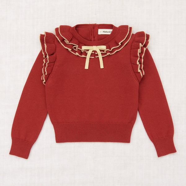 The Long Sleeve Cotswolds Ondine Top is a fine-gauge pima cotton knit, featuring two rows of gathered ruffles with contrast trim at the neck and shoulders, with corozo button closure at the back of the neck. Finished with a bow at the center front.