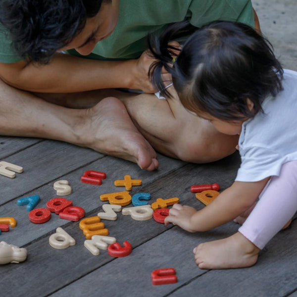 Develop your language skills with this alphabet set! 26 Lower case letters and 5 vowels are included to encourage communication and language practice (31 pieces in total). We use red colors for the vowels so children can begin to recognize vowels versus consonants. There is also a printable play card for viewing or you may download online.