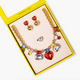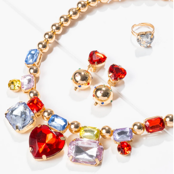 - Set includes stretchy "gold" chain for easy on/off, ruby red clip-on earrings, a "diamond" heart ring, and an oversized heart pendant.