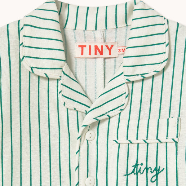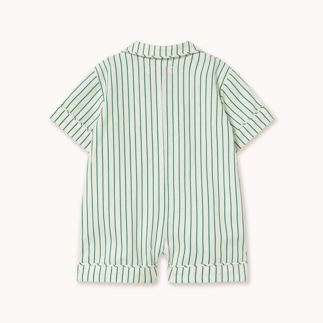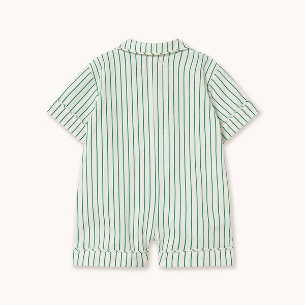 - The Emerald Stripes Playsuit for baby brings comfort and timeless style to the everyday wardrobe. Made from a classic linen and cotton blend, this style features a relaxed silhouette with a collared neckline. Concealed snap closures at the leg openings make diaper changes quick and easy.