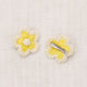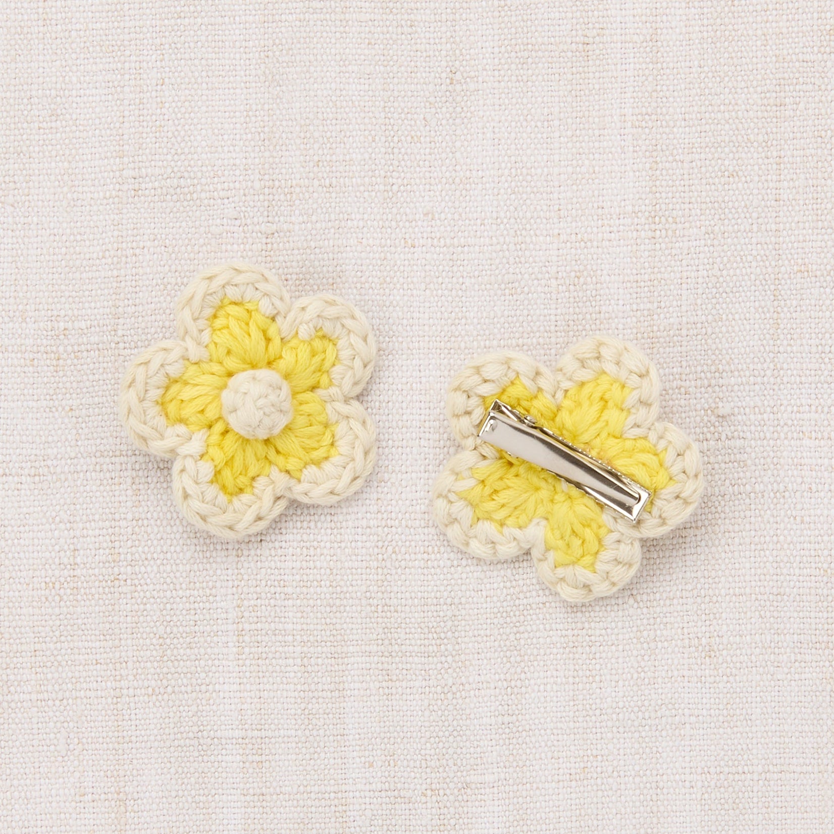 A two-color hand-crocheted flower set on alligator clips in pima cotton. A little pop of embellishment for any look.