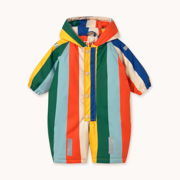 - Keep little adventurers warm and dry in this multicolor striped snow one-piece. Padded and cozy, it features a sherpa-lined inner panel for extra warmth, a hood, elastic cuffs, and a full zip with snap-button placket for easy on and off. The adjustable inner waist ensures a perfect fit, while reflective strips add a smart safety touch. Made from wind- and water-resistant fabric, ready for every snowy day.