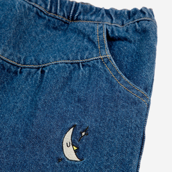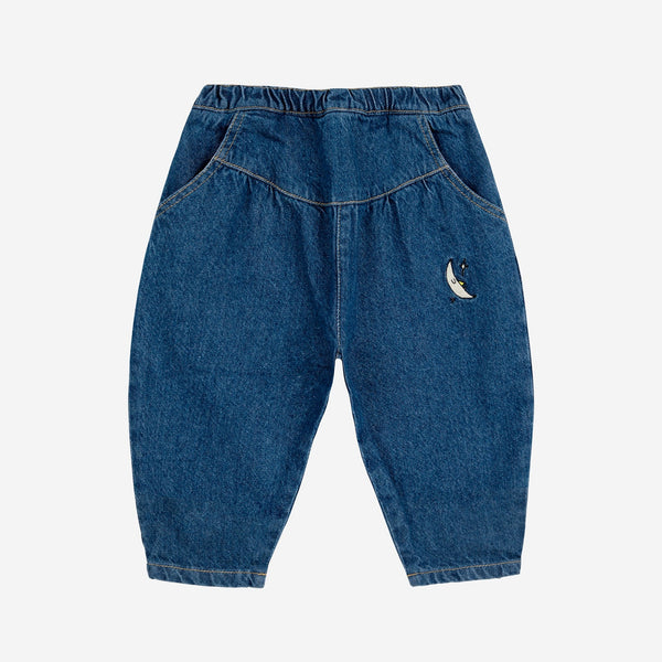 - Well hello dreamy denim! The Beneath the Moon Denim Pants for baby are classic and comfortable. Featuring a tiny embroidered Moon that is oh so sweet, these pants offer a baggy, very relaxed fit for our little friends on the move.