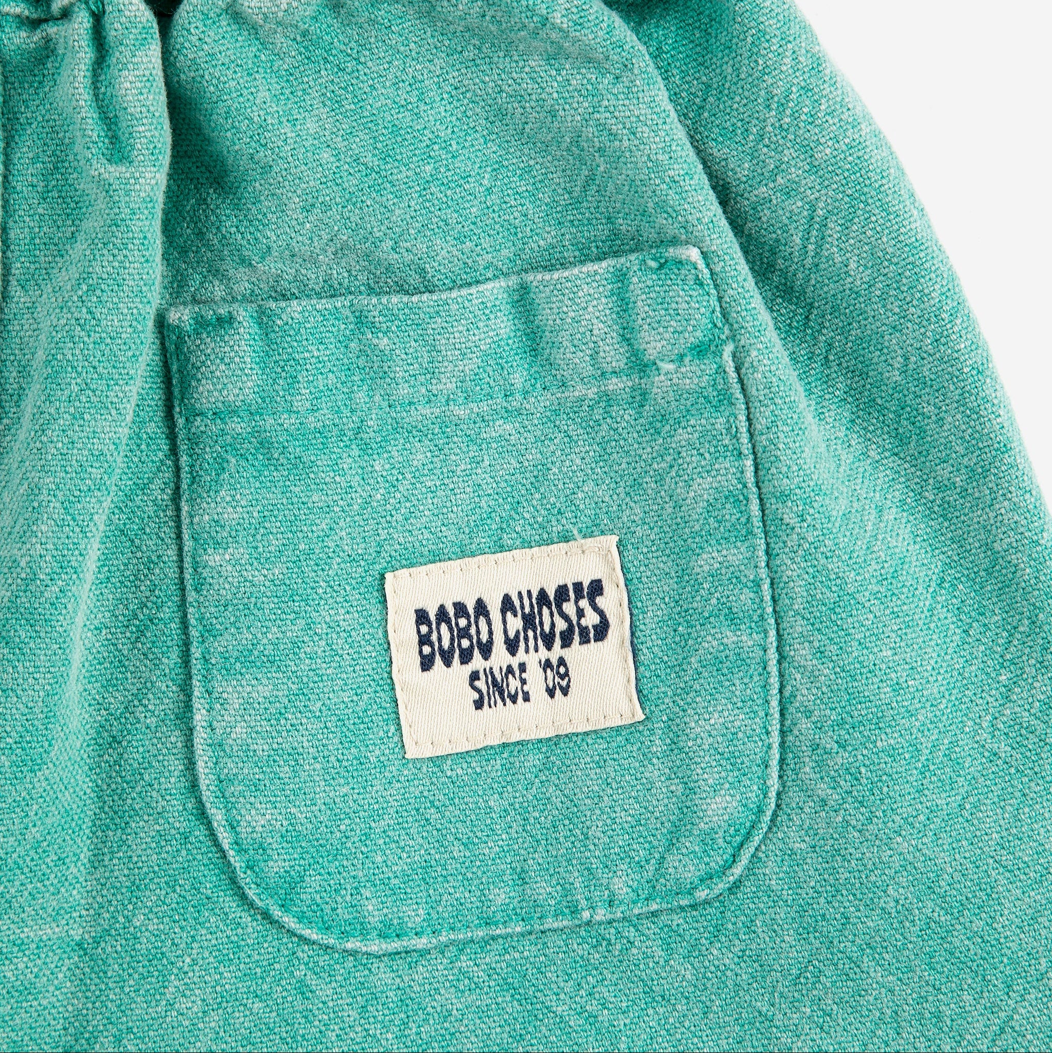 • The Bobo Choses Since 09 Woven Pants offers a little mix and match moment for baby.  Designed in a cool green that feels worn in, this style has stretch at the waist for baby to move in.  We adore this style paired with the Mr. Pickles Sweatshirt for baby!