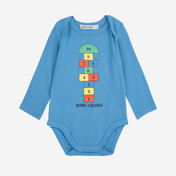 - The Hopscotch Body for baby is designed in a l/s silhouette and features the adorable hopscotch graphic. We adore the pretty blue hue and easy fit this style offers.