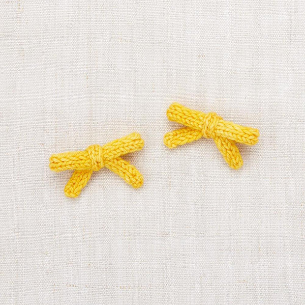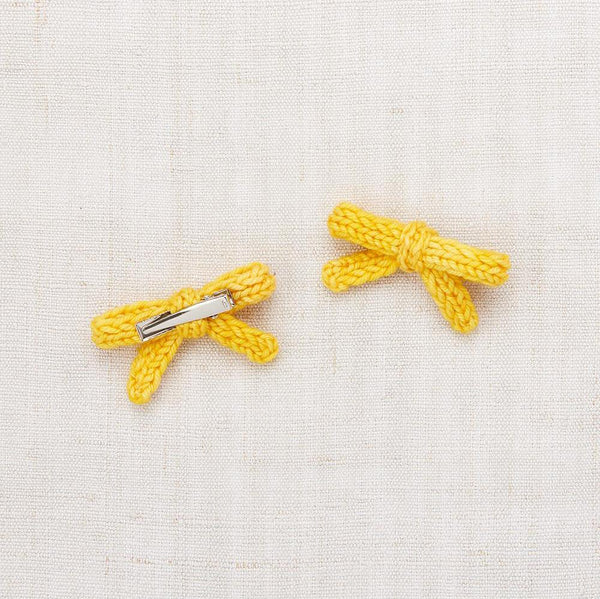 A set of hand-knit slim bows on alligator clips, in pima cotton. For matching your favorite knitwear, adding a pop of color, or gifting to a friend.