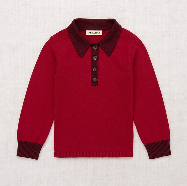 A polo-style sweater in a fine-gauge Pima cotton knit. Featuring raglan sleeves with contrast ribbed cuffs, a contrast front placket with horn button closures, and short ribbed hem.