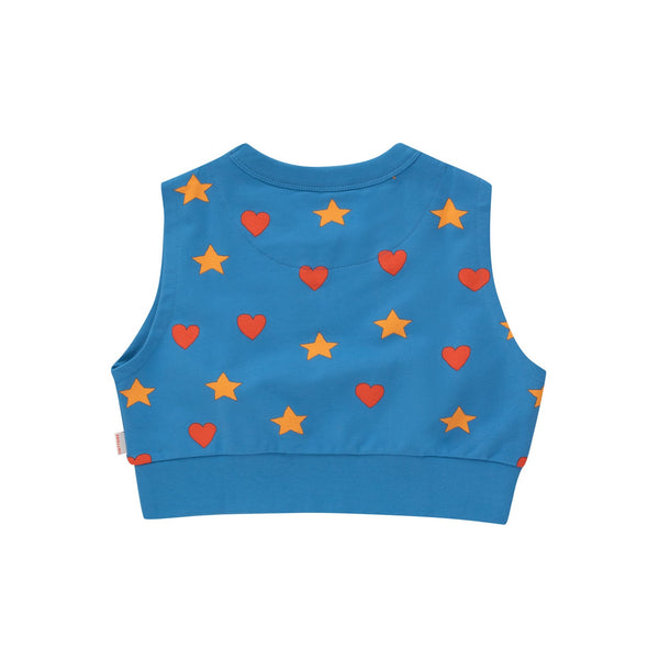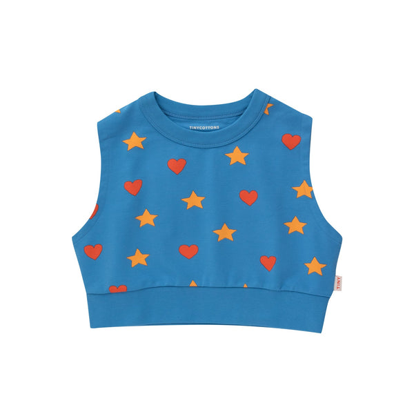 - The Tiny Hearts and Stars Sleeveless Sweatshirt in blue is a new shape this season adorned with love and twinkle for your little one. Crafted from a cozy pima cotton blend with a hint of stretch, it's perfect for snuggling and play. Made in Portugal, it's a wardrobe essential that pairs comfort with style.