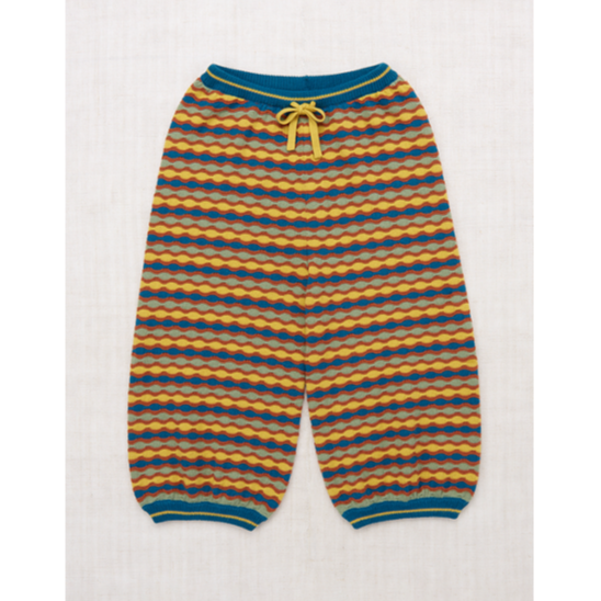 The Merengue Yves Joggers are a voluminous style in a fine-gauge Pima cotton knit, featuring a multi-color wavy pattern with raised details, a ribbed striped elastic waistband with an adjustable tie, and roomy legs gathered at the hem with ribbed striped cuffs to keep out the cold.