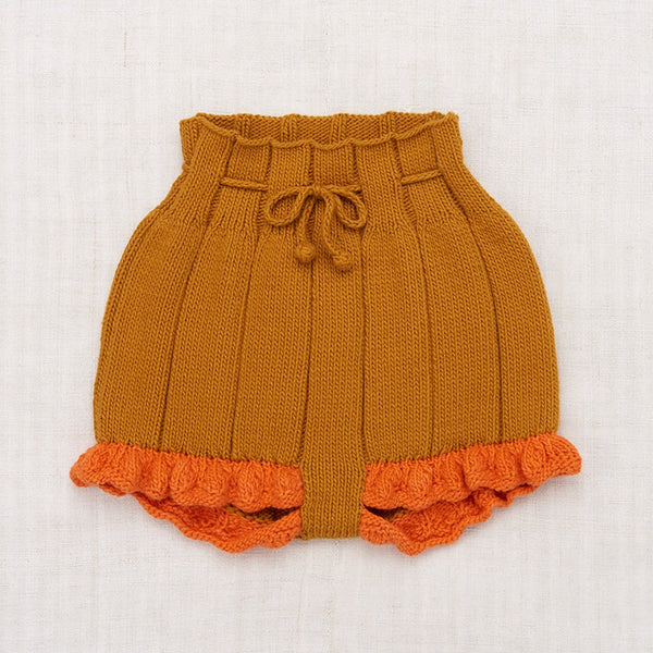 - An entirely hand-knit short in a heavier-weight Pima cotton knit, with an all-over wide rib, a popcorn tie drawstring waist for a secure fit, and a contrast scalloped hem. This piece sits high at the waist.