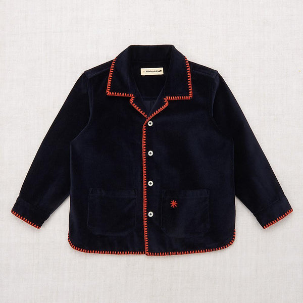 The Leon Top is a long-sleeved top in soft 100% cotton velvet. This style features a point collar, rounded hem with side vents, contrast embroidered trim detail, corozo button closures, and a small hand-embroidered Misha & Puff star motif.