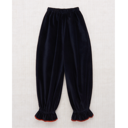 The Velvet Zuzu Pant is a statement-making, pull-on pant in soft 100% cotton velvet. This style features a gathered elastic waistband and ruffle hem detail with contrast embroidered trim detail, adding a playful touch of flair.