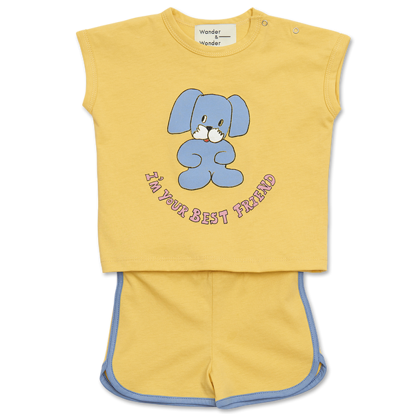 - For our tiniest friends, the Baby Tank Set. This sweet ensemble includes a loose fitting baby tee complete with snap closures, along with a pair of retro-feeling gym shorts offering plenty of stretch at the waist.