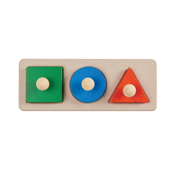 Learn about basic shapes: Square, Circle, and Triangle. This knob puzzle helps develop fine motor skills and hand-eye coordination while tracing each shape and then placing it back in its place.