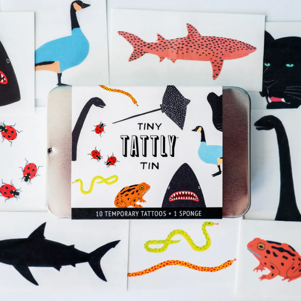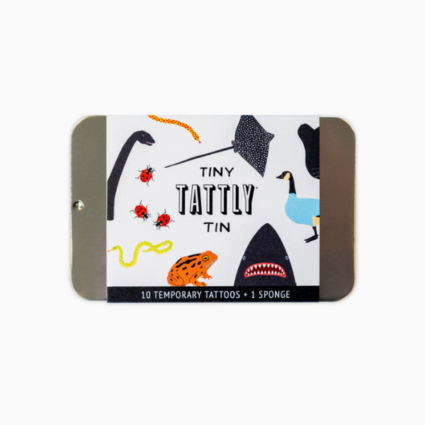 - Tin includes 10 temporary tattoos plus a mini sponge